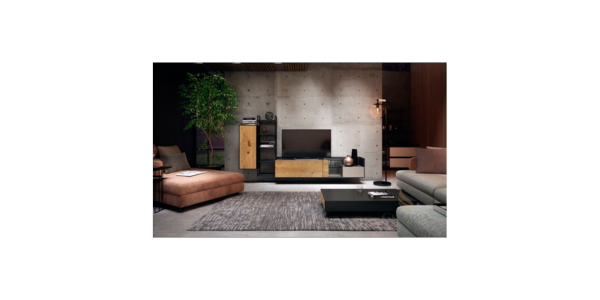 >> Módulo bajo 1 puerta abatible, 1 cubo con puerta batiente cristal y 1 cajón, de 200x43x45 cm, colgado a pared. También posibilidad de zócalo o patas metálicas.